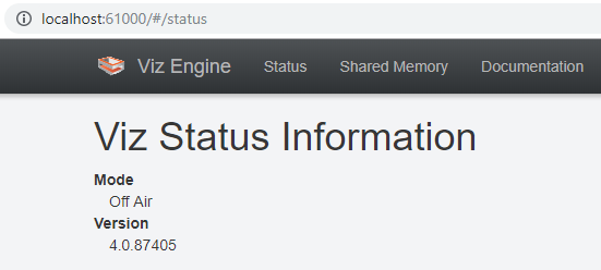If User Account Control is active, press Install after setting the Port. The default port for the Viz Engine web service is 61000. After restarting Viz, the REST interface can be accessed by navigating a web browser to http://localhost:61000. The landing page displays the status of the Engine, with information on which mode it is running in and its version number.