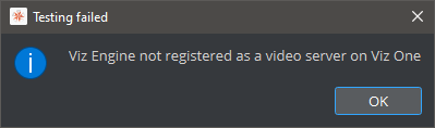 If Test Connection returns that the Viz Engine is not registered as a Video Server, the Engine must be added as a server in the Viz One Studio Administration. Please refer to the Viz One documentation for further information.
