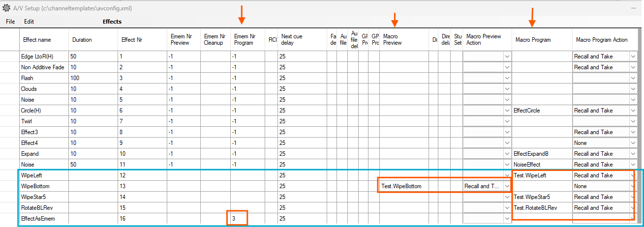 In the screenshot below, the effects WipeLeft, WipeStar5 and RotateBLEmem are configured as global macros to be executed on Program.