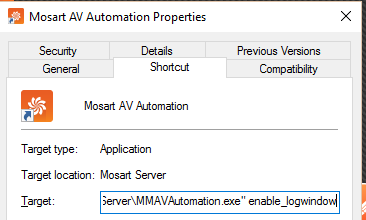 In Properties > Shortcut> Target, add the command parameter enable_logwindow.