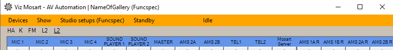 The Viz Mosart operator can also perform this action from the main UI. See the Viz Mosart User Interface section of the Viz Mosart User Guide, under Main Menu, Standby for further details.Idle: This is an indicator that AV Automation is in idle mode, not a menu option. In this state, the menu bar turns orange.