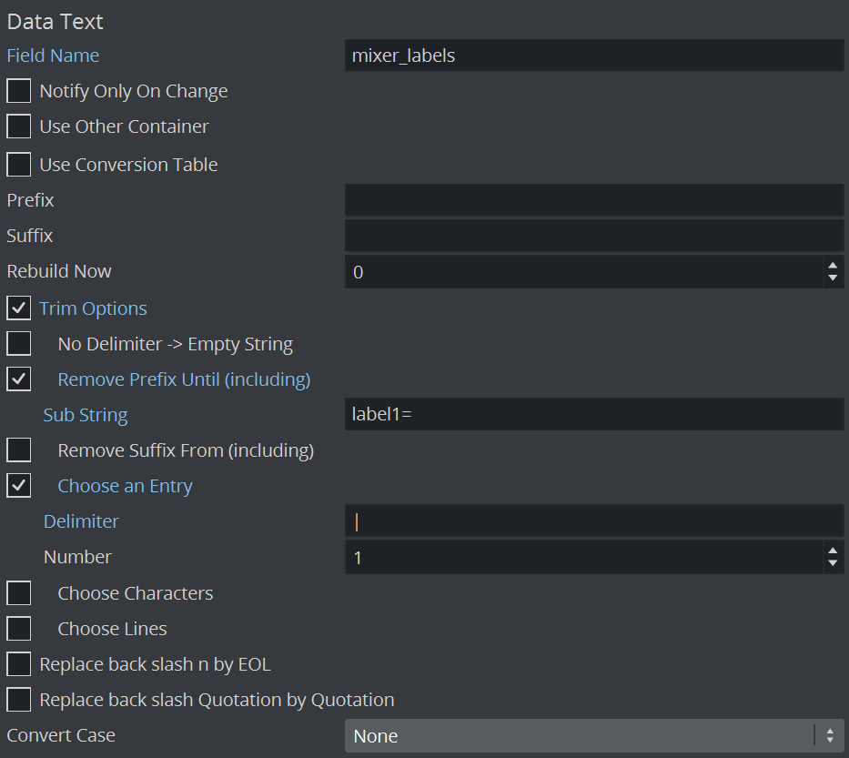 Set Field Name to the same ID as used in the parent plugin. In this example, mixer_labels.