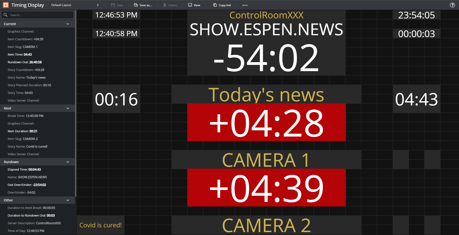 • Timing Display: A web application that displays selected timing details from the active Viz Mosart rundown.