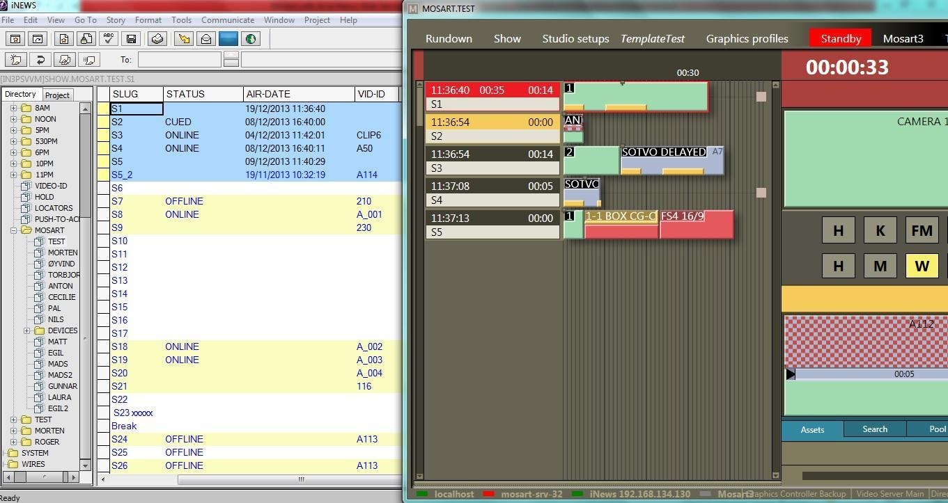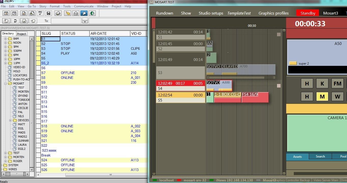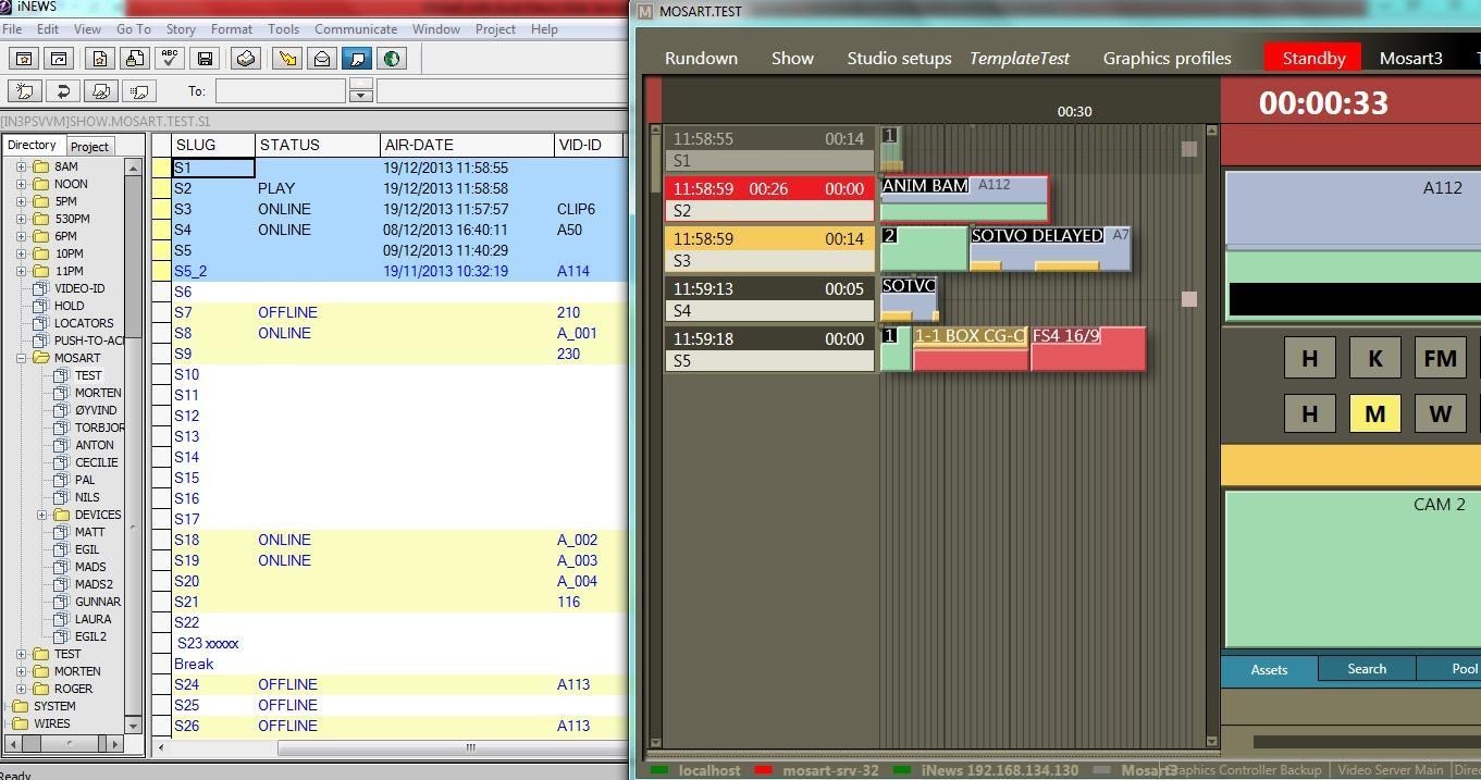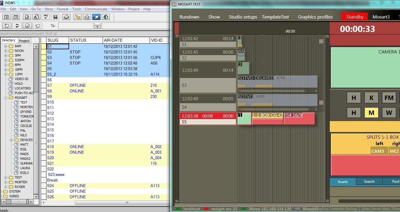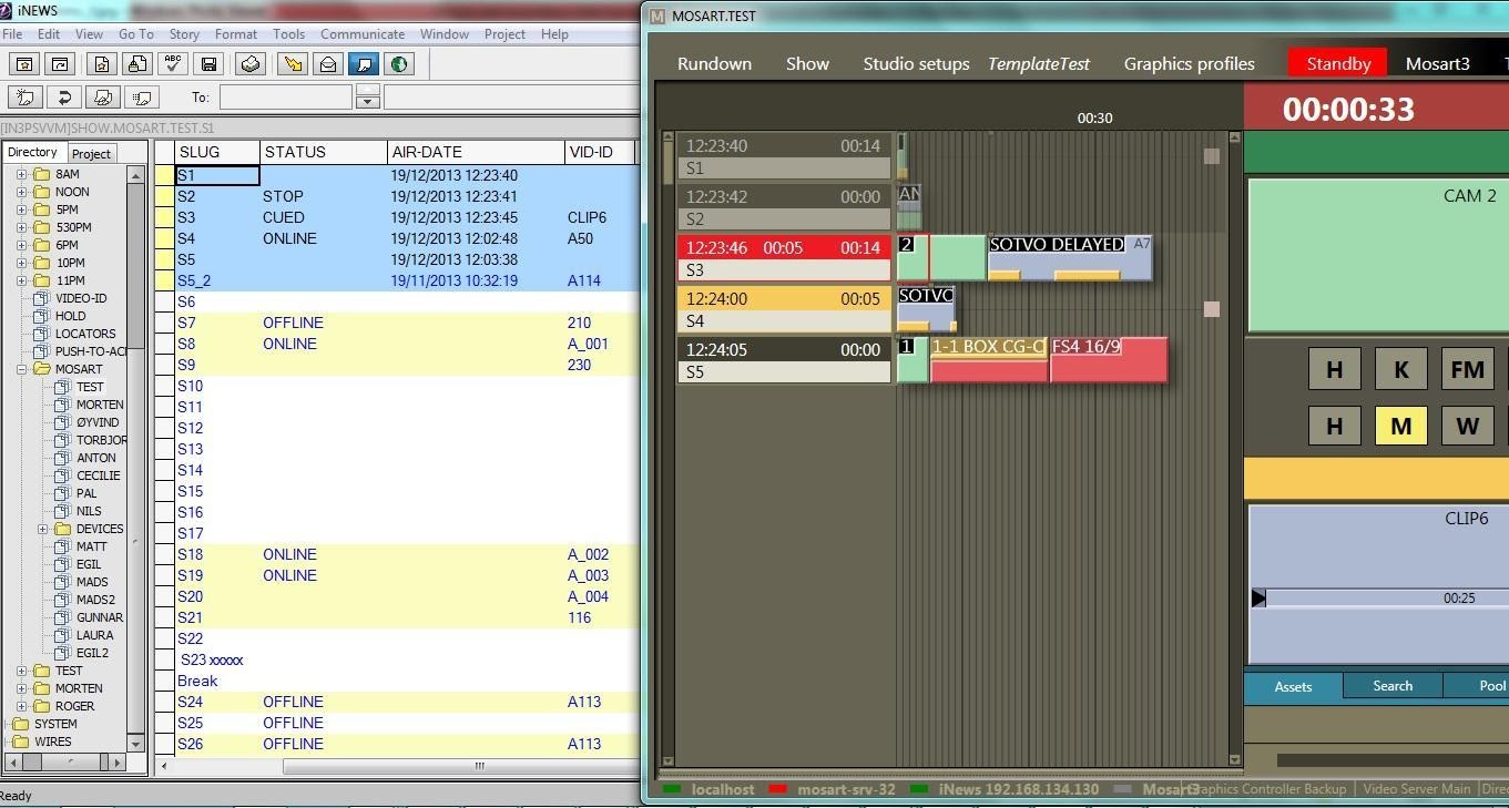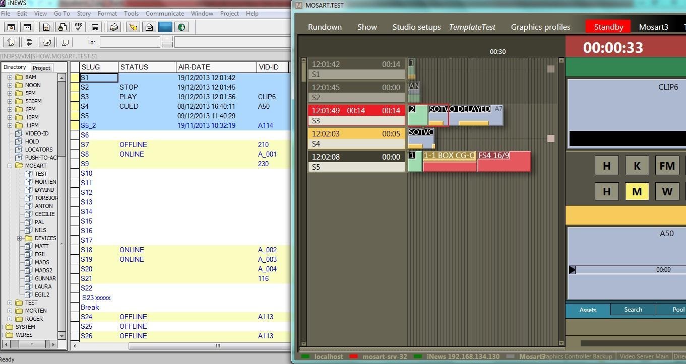 Avid iNEWS Web Service can be configured with Viz Mosart connected to iNEWS through FTP. The main purpose is sending status for stories that contain clips (Online/Offline for clip availability, Cued, Play or Stop and duration, as provided by the video server), but the system can also be configured to send status for all types of events (Cameras, DVEs etc.).