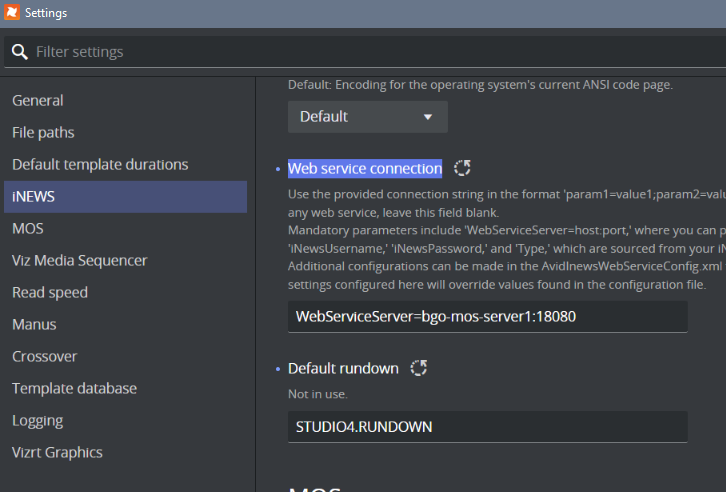 In the Web service connection field enter a connection string in the following format param1=value1;param2=value2;... to establish a connection with the Avid iNEWS Web Services.