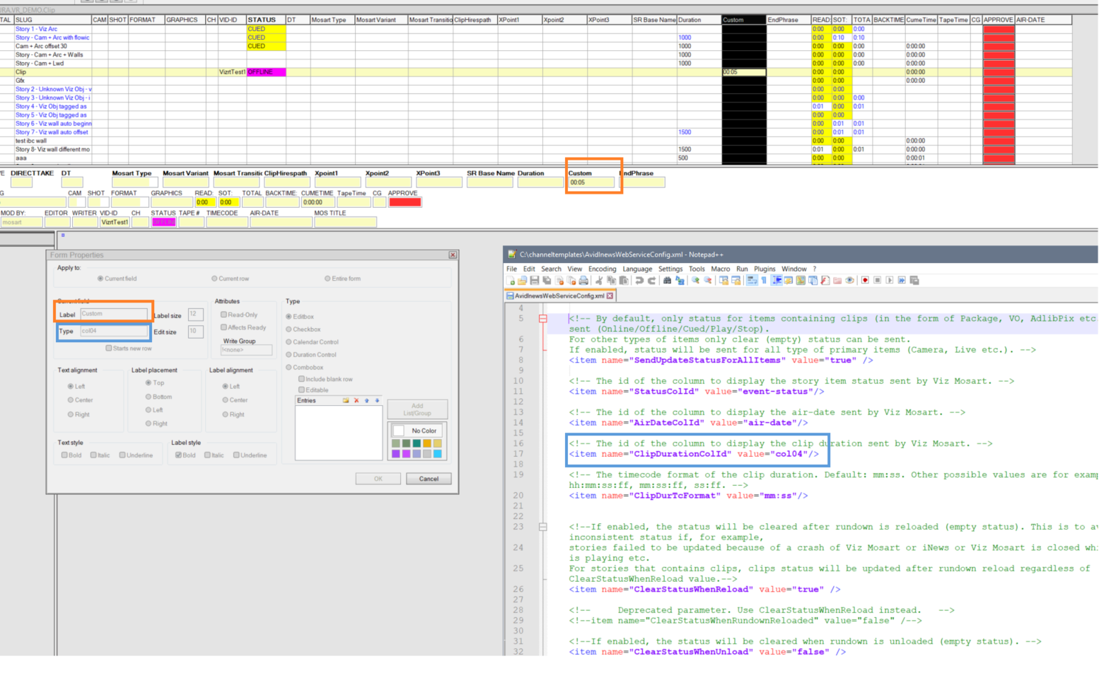 StatusColId, AirDateColId and ClipDurationColId: Set to the corresponding iNEWS column id.