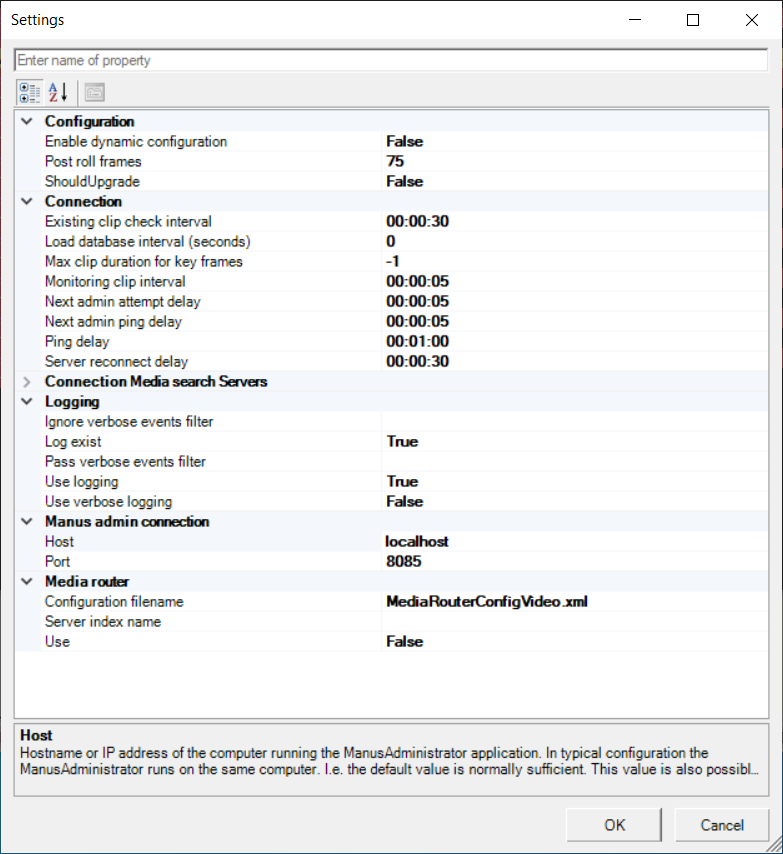 Configuration filename (ConfigurationFilename): Determines the configuration file to use for Media Router. Default: MediaRouterConfigVideo.xml.