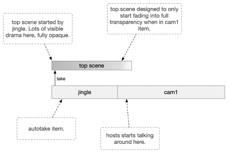A top scene is a scene loaded on to the Viz Engine front layer, on top of the current switcher scene. This type of scene is typically used for opener or closer animations for a show.