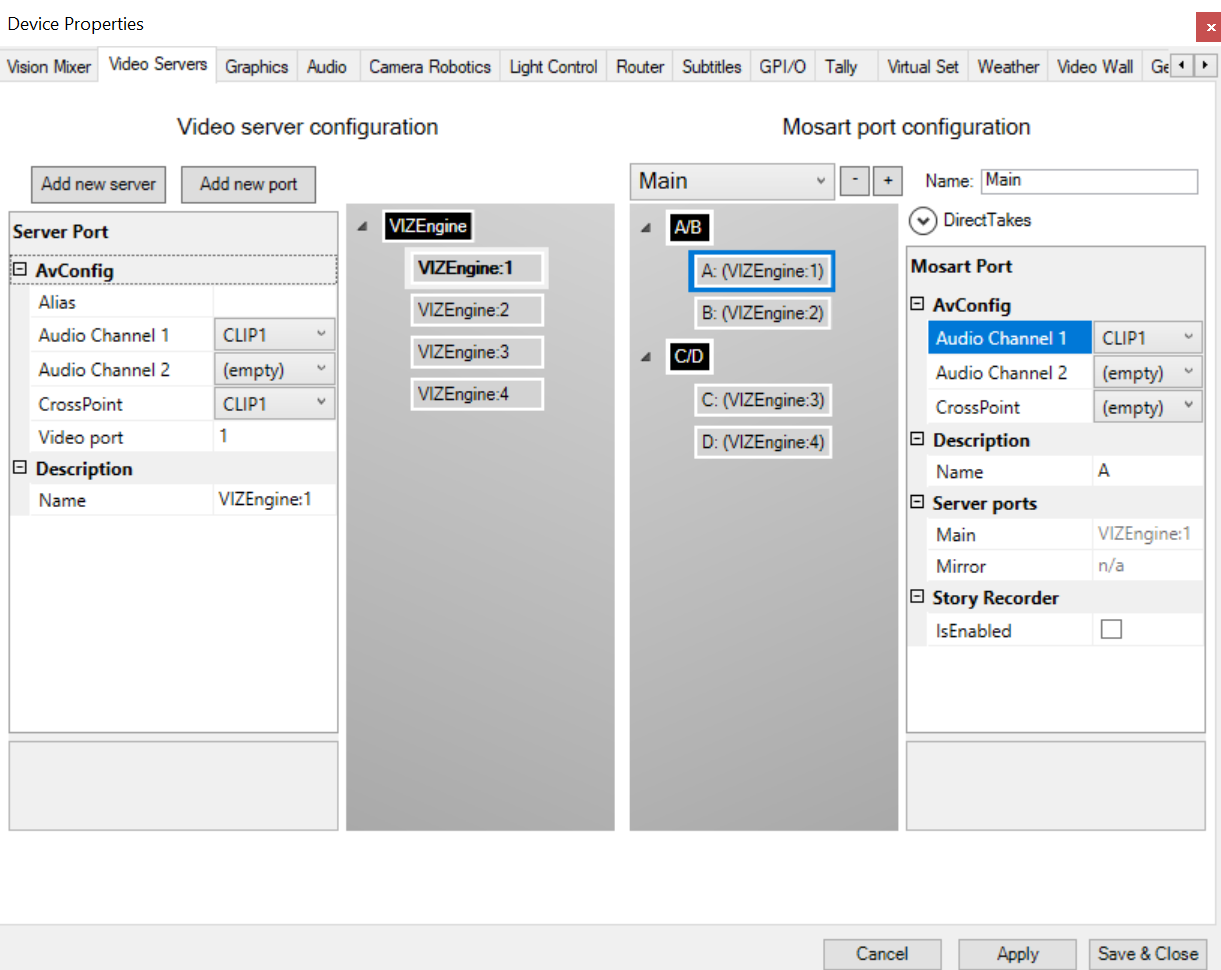 Instead, the crosspoints on the video server ports in AV Automation must be configured to point directly to the port names configured on the Viz Engine.