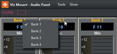 The bank for each fader can be changed by right clicking on the fader label and selecting the bank from the displayed pop-up list.In the Show menu there are options to show MIDI commands and to highlight in orange the selected bank on the faders.