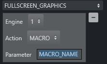 FULLSCREEN_GRAPHICS | Engine: The engine number on which control commands execute. Action: CONTINUE MACRO Info: For VIZRT graphics, two special macros are available: