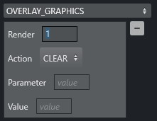 OVERLAY_GRAPHICS The Overlay Graphics Interface (OGI) provides control and monitoring of overlay graphics for all Viz Mosart-approved graphic engines. | Render: All OVERLAY_GRAPHICS commands share the Render parameter. This parameter can be set to send the given command to a specific engine, or to engines which currently have active graphics On Air, to execute the specific command. Alternatively, Engine 1: | For a detailed description, see section Overlay Graphics Interface of the Viz Mosart Administrator Guide. |