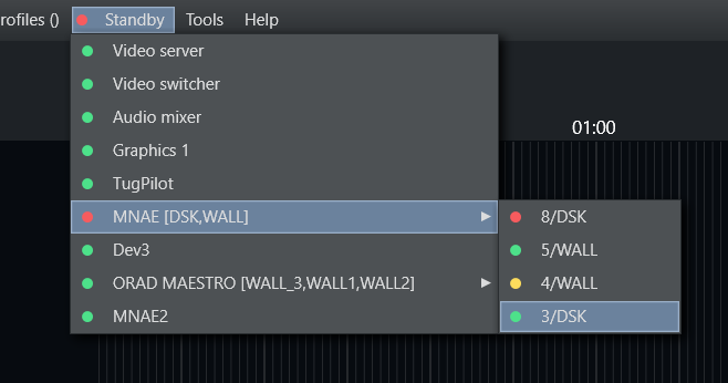 Once in state standby, all Viz Mosart commands sent to the selected equipment are disabled, until the device is re-enabled from this menu.
