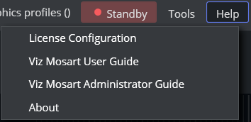 • License Configuration. Opens the License Configuration menu, intended for the Viz Mosart administrator. Please refer to the section Licensing in the Viz Mosart Administration Guide.