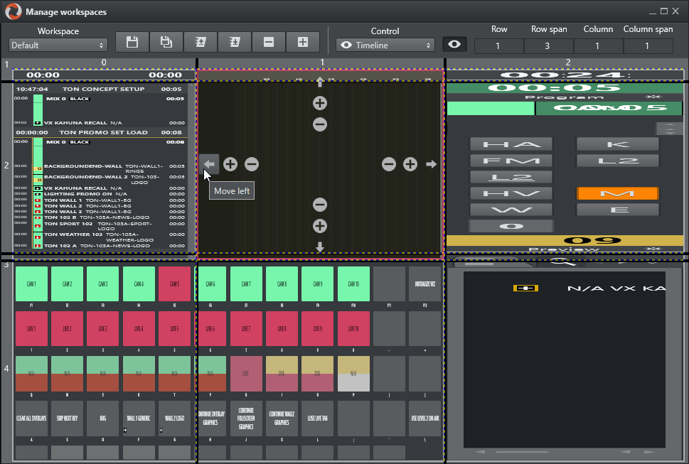 In the Workspace Manager, the various windows in the GUI can be removed or added by checking and unchecking the eye icon next to the Control menu. The sections can also be adjusted using the buttons - , + and arrows as shown in the timeline window in the image underneath. - and + changes the column span and row span, whereas the arrows moves the highlighted section to the section the arrow points towards.