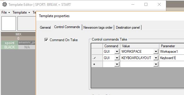 In the Parameter column, enter the name of the Workspace (the naming must exist in the Viz Mosart UI).