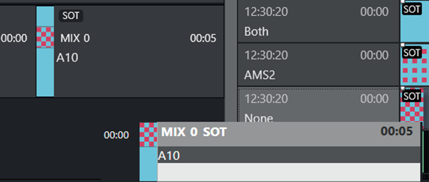 The element also appears in the Assets window as a colored slug with a green top half and light blue bottom half for clips, and orange bottom half for graphics. They can be taken on air or to preview either by right-clicking and using the context menu in the Timeline or the Assets pane.