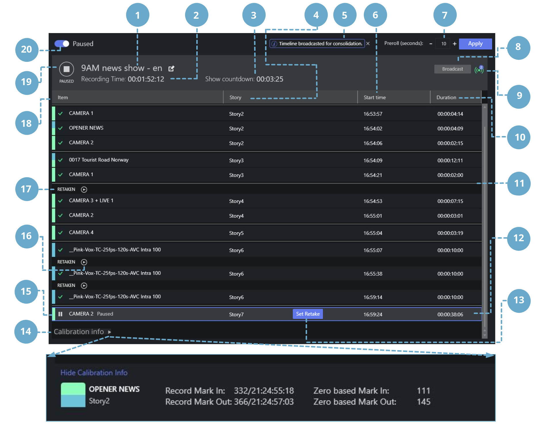 Timeline: A chronological display of on-air events (for example, story items) showing their start time and duration. In the Story Recorder window, these are represented by rows.