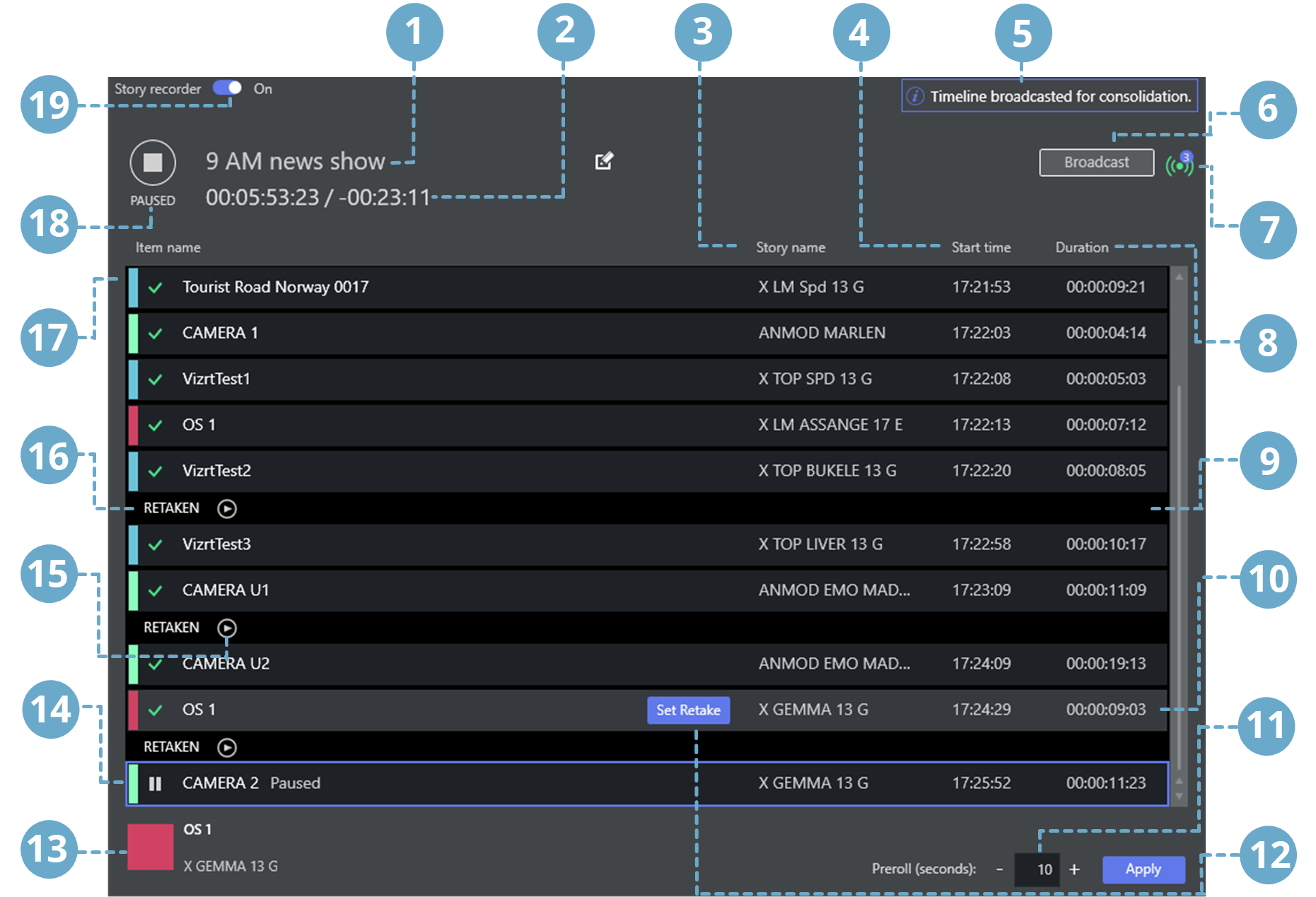 8 | Duration: Story item onair time in HH:MM:SS:FF (frame count only shown after the item is paused/ recorded). |