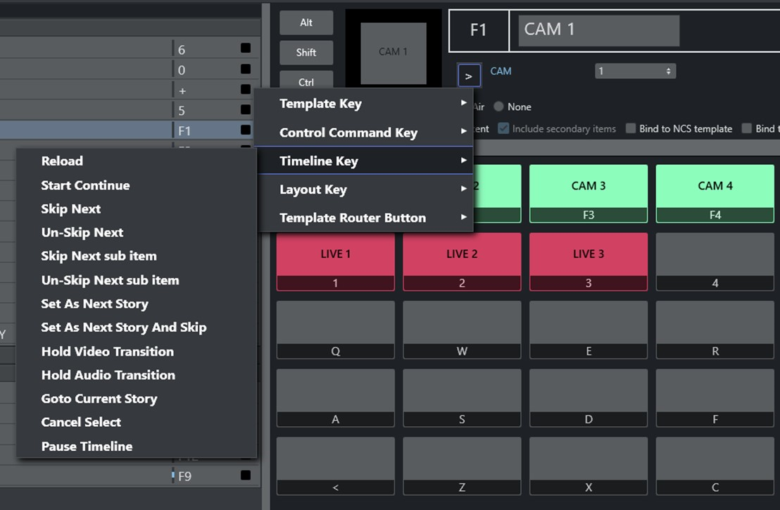 The Timeline Keys comprise basic commands that directly affect the running of a rundown in Viz Mosart: