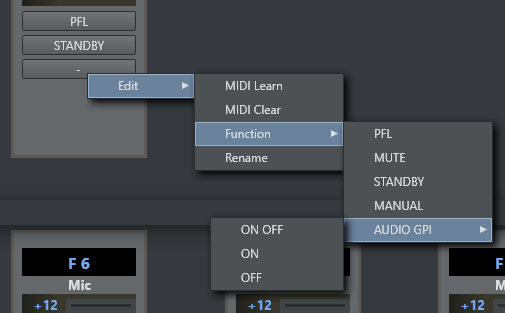 Any function buttons below the GUI faders can be assigned to any of the function keys on a physical audio panel.