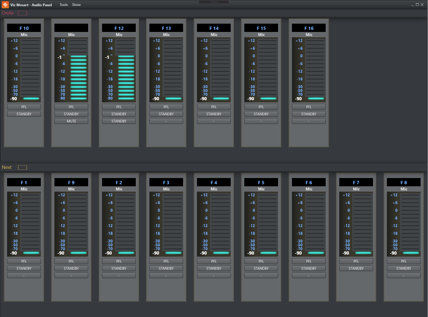 The Audio Panel is connected to the Viz Mosart Server, replicating faders, on air faders and faders in Preview.