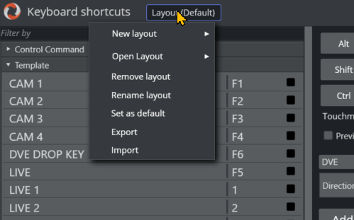 In the Keyboard shortcuts menu bar, left-click over the Layout (naming) text. of the menu.