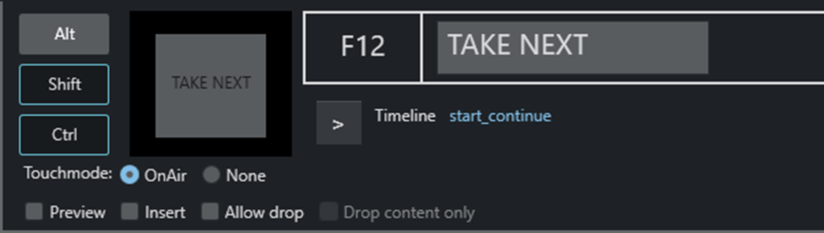 The main key appears in the rectangle, any modifier keys are highlighted to the left (in the illustration above, Shift and Ctrl).Type the name to appear on the shortcut button in the rectangle to the right (in the illustration above, the field with TRANSITION_TYPE)