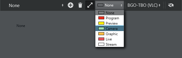A selected source has a solid color as title background instead of the otherwise white background. Program and Preview have a dotted line to indicate that the selected source can be assigned.Click either Preview or Program to put the template of the selected source in Preview or directly On Air.