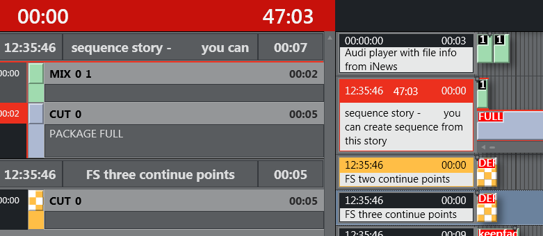 • The bottom half (FS three continue points) shows the next story to go On Air, highlighted in orange.