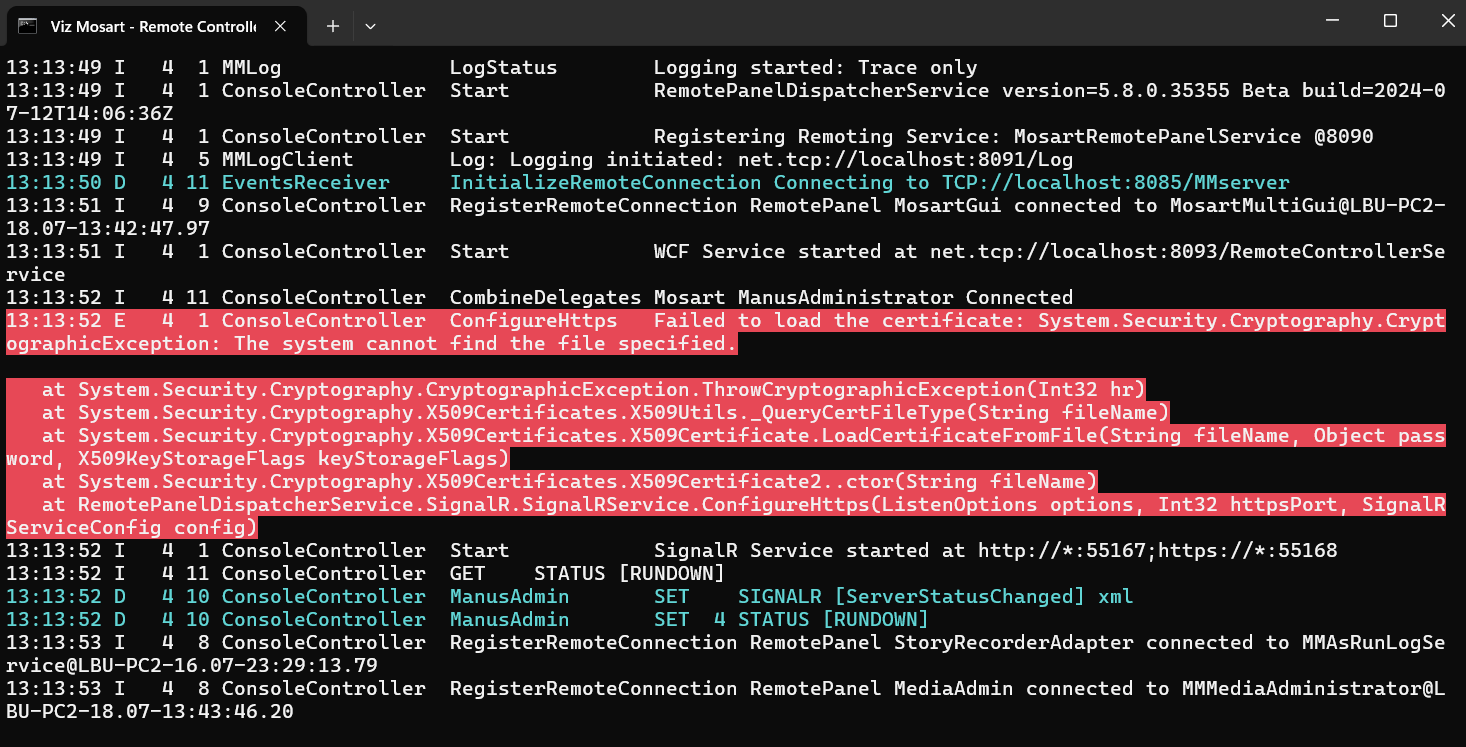 • Start Mosart Remote Control Service (RCS) as console to investigate further the issue. If the service is running as Windows service, stop it first.