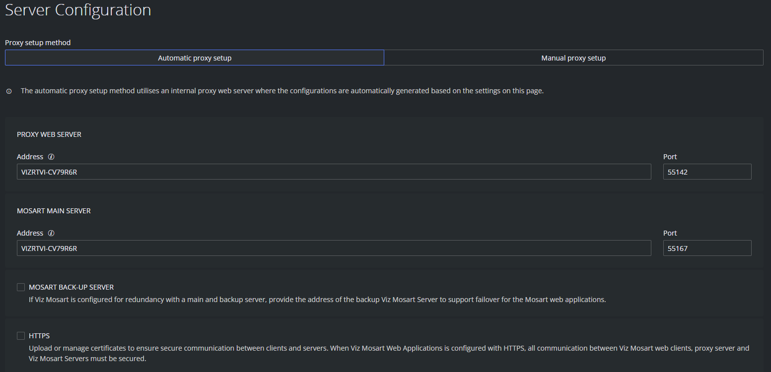 If the external proxy server is configured with HTTPS, you must also set up HTTPS for the Viz Mosart Web Applications and Mosart servers.