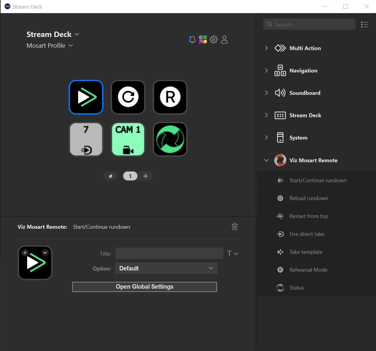 The Elgato Stream Deck plugin for Viz Mosart allows you to send Viz Mosart rundown actions including Start/Continue, Skip Next, Unskip Next, Take a template. You can also fire a Direct take or a Control command.