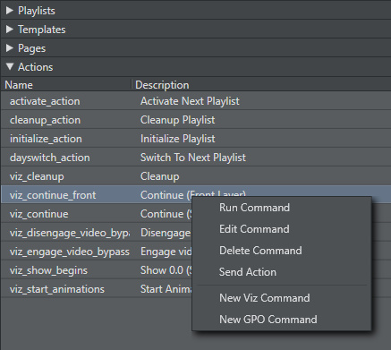 Viz Multichannel’s Actions pane allows you to define General Purpose Output (GPO) commands, Viz Ticker commands and Viz Engine commands. GPO commands are handled by Media Sequencer. Both Viz Ticker and Viz Engine commands can be used in Viz Multichannel to automate certain tasks. The commands behave as secondary events, in that you can also apply rules and schedule them in the playlist. Ticker actions are accessible from the Actions panel seen in the left pane. Ticker actions integrate tickers from Viz Ticker. Once the ticker has been created, it can be imported into Viz Multichannel.