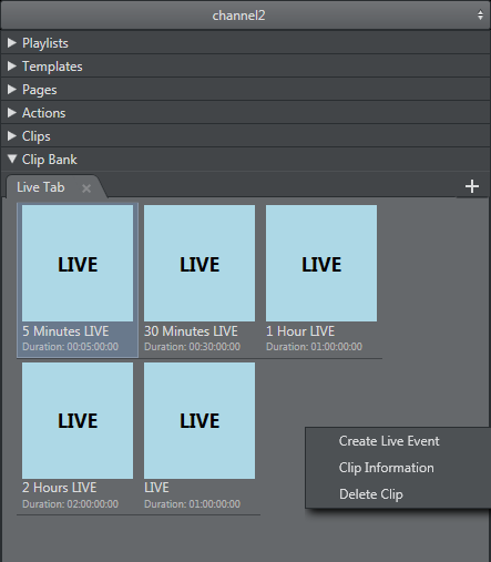Clip Bank contains LIVE events and Viz One clips. You can have LIVE events pre-created in this clip bank to allow for rapid insertion of LIVE events into the running playlist. When you first create a channel, the default clip tab name "LIVE" with four default LIVE events is created.