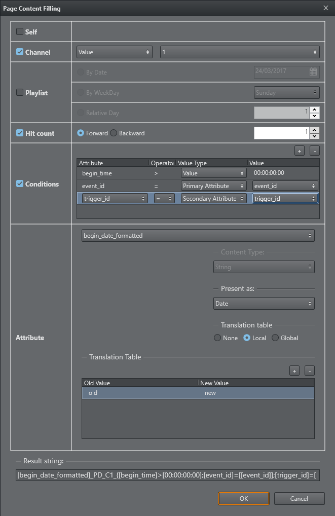 - Attribute: Allows you to select an attribute from a located primary event or the current secondary event. The fields available in the list depend on what is defined in the Mapping Table under General Settings. Translation tables can be used to define arbitrary value-translations, via a value=value-table. There are two translations tables: