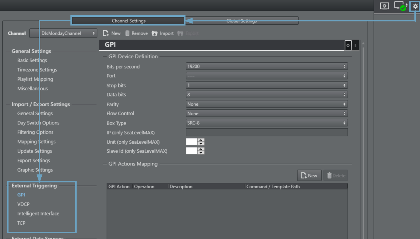 GPI is a type of trigger that does not relate directly to a playlist event. A list of commands allows you to define what happens when a playlist is received from an external device.