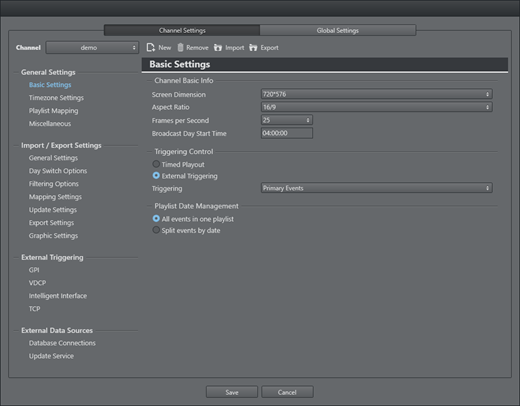 - All events in one playlist: When selected, Viz Multichannel will only allow one continuous playlist exist per channel. Regardless of time and on-air date, all events are included in the imported playlist. This setting is recommended.