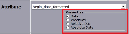 For any page, set Item -> Relative Item -> After (1) and Attribute to begin_date_formatted: