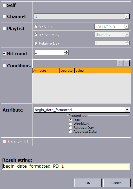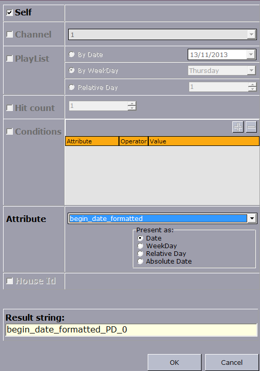 - Date: Date is the default setting for attribute begin_date_formatted. It uses Next, Today, Tonight and Tomorrow states to define date. To represent program which is scheduled for the days later, it symbolizes the date of corresponding playlist as: At dd/mm/yyyy