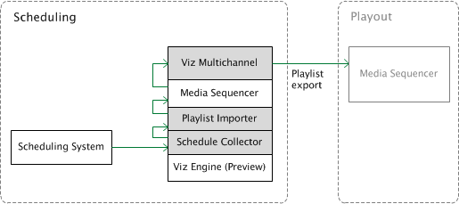 Viz Engine is used for preview and is typically a VGA version without SDI out capabilities. This setup allows the Scheduling Center to prepare and preview playlists before sending them to playout by the program Viz Engine(s).