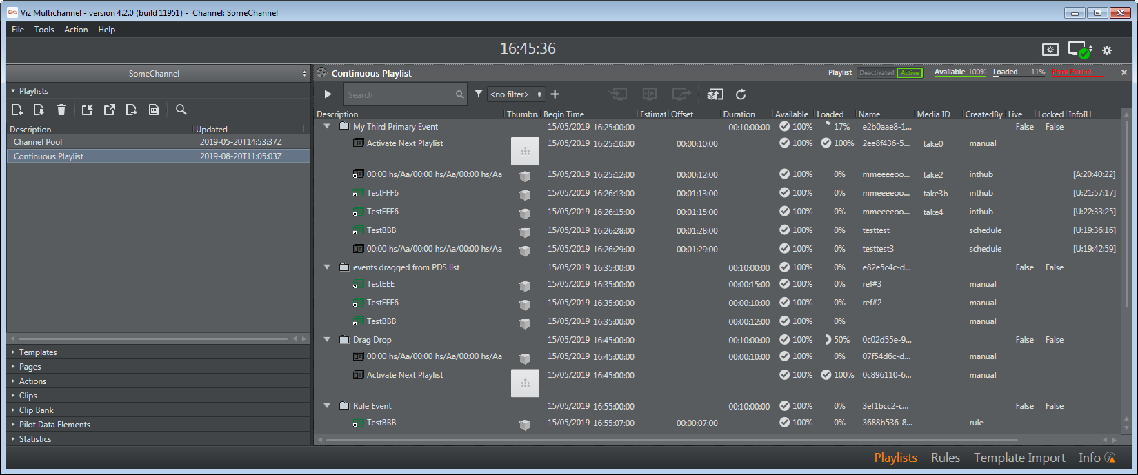 - Select panel to work on: Playlists, Templates, Pages, Actions, Clips, Pilot Data Elements or Statistics.