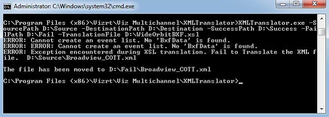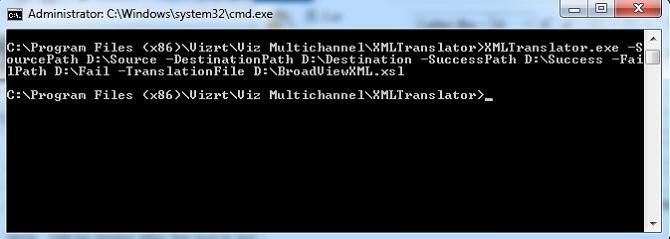XMLTranslator.exe -SourcePath D:\Source -DestinationPath D:\Destination -SuccessPath D:\Success -FailPath D:\Fail -TranslationFile D:\BroadViewXML.xsl