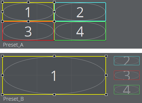 When switching from Preset_A to Preset_B (see diagrams below), channels 2, 3 and 4 become smaller and sweep to the right, off screen, and channel 1 stretches to fill the whole video wall.