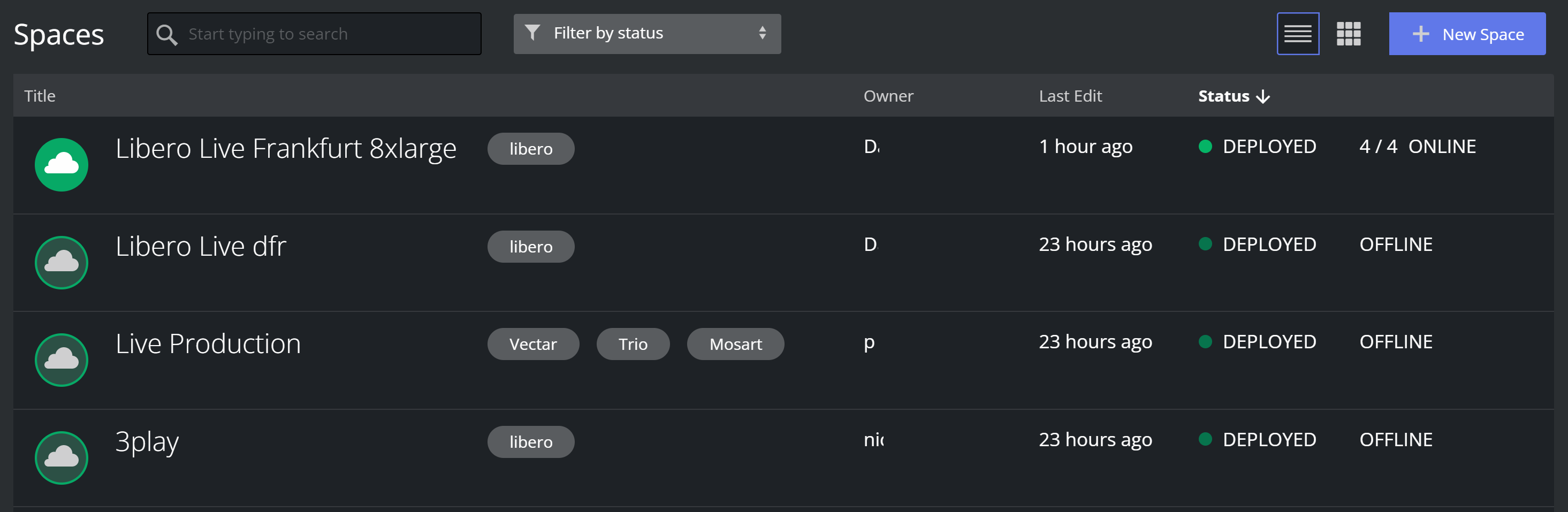 All spaces created in the organization are listed under the Spaces tab. Each space has details such as the title, list of available apps, owner, last edit and status.