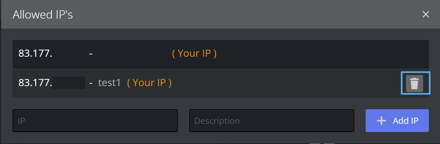 Allowed IP's: You can a list of allowed IPs to access this space. You can remove an IP from the list by clicking the Trash can icon.