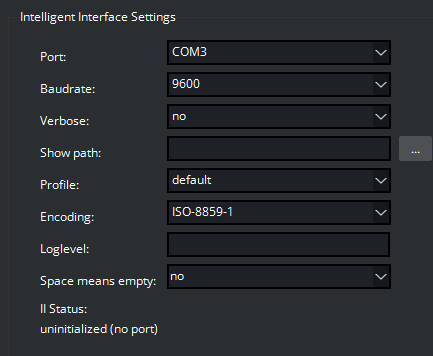 Serial port config: If a serial port connection is to be set up the COM port number and the data baud rate must be specified here.