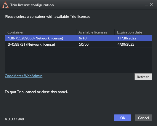 To switch container, go to Help > Trio Licenses to open this dialog box again.