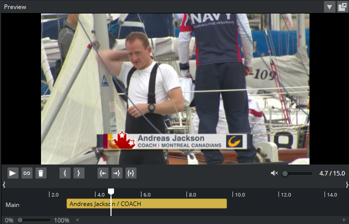 Drag graphics pages or playlist elements onto the timeline of the clip. The video preview displays snapshots of the graphics as overlays (fetched from Preview Server), and can be manually adjusted on the timeline.