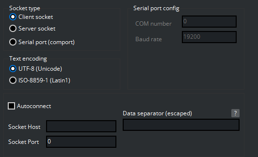 When the socket object receives the data separator, the OnSocketDataReceived event is triggered, and the data received since the last separator is issued (not including the separator itself). If Data separator has no value, the OnSocketDataReceived is called continuously as long as data is received.